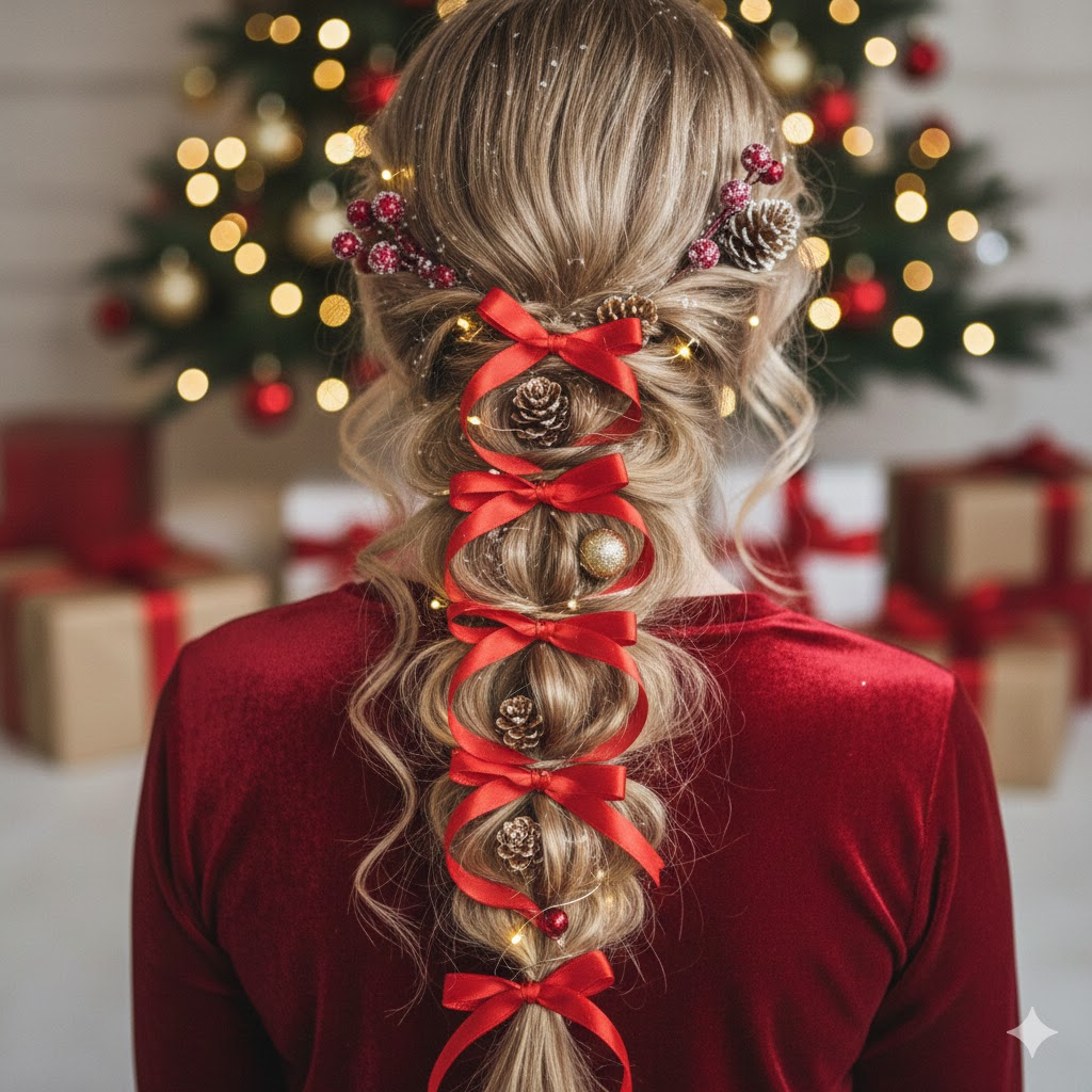 - Messy Side Braid – Loose braid with holiday ribbons.